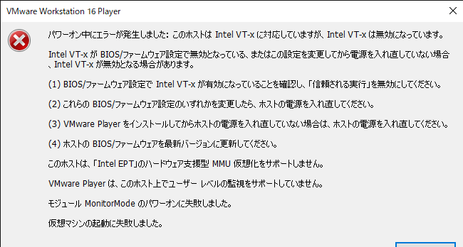 Maruton S Memorandum 日記 Vmware Playerのエラー このホストは Intel Vt X に対応していますが Intel Vt X は無効になっています