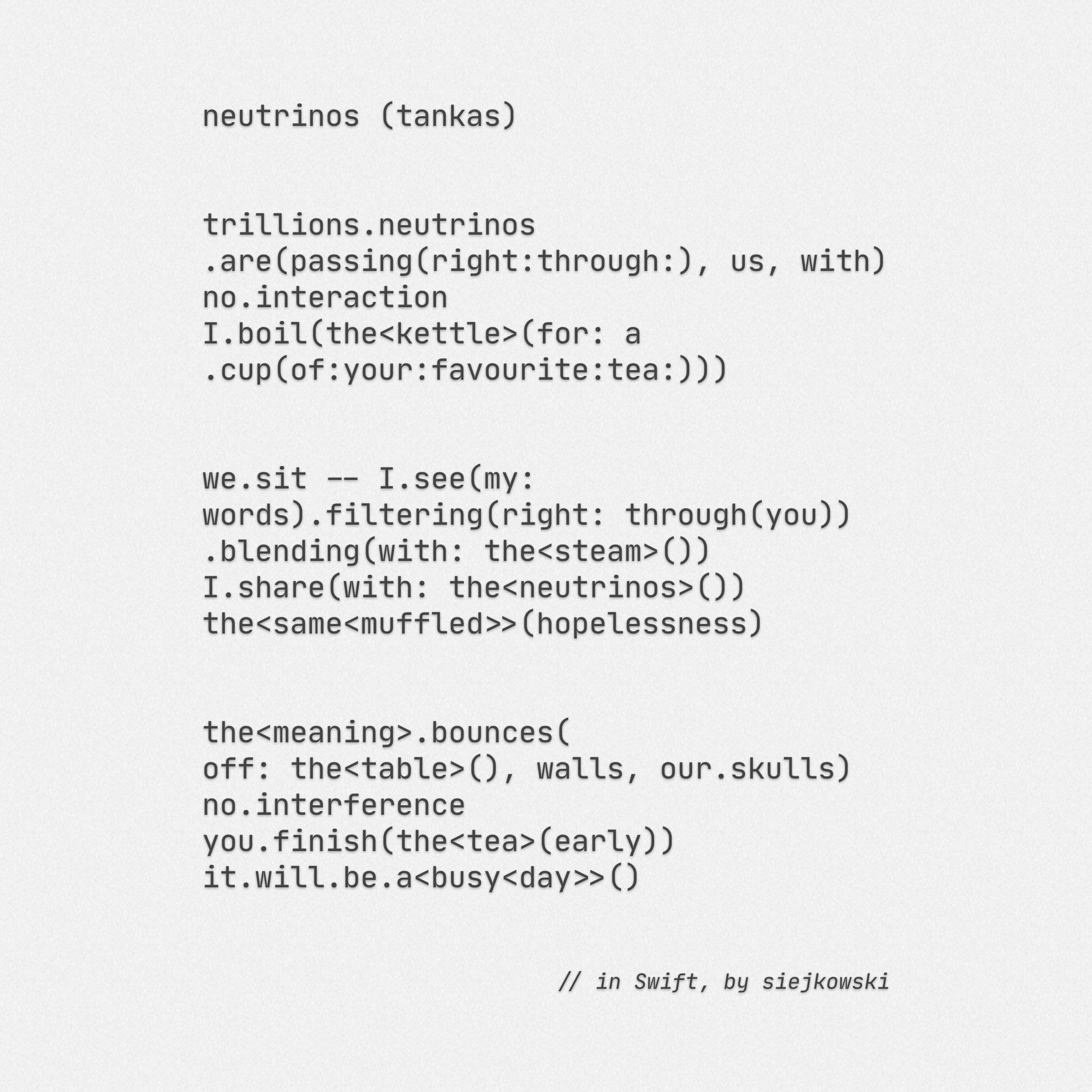 Krzysztof Siejkowski On Twitter For 5th Week Of Code Poetry In Swiftlang I Want To Share Neutrinos It S Built Of Tankas Tanka Is A Japanese Poetry Form 5 Verses 5 7 5 7 7 Syllables I