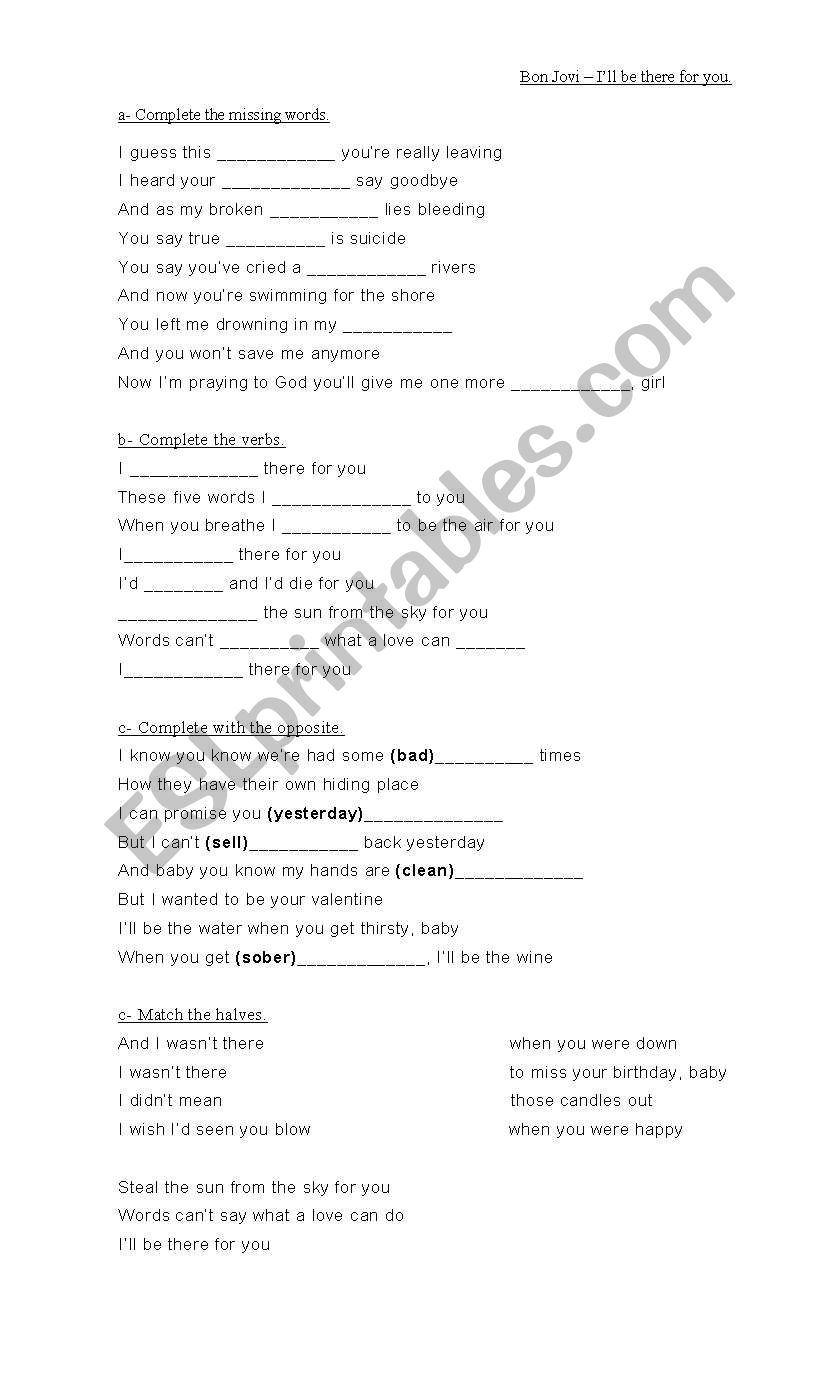 I Ll Be There For You Bon Jovi Esl Worksheet By Carolexa